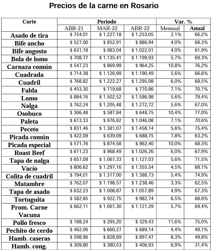 Los precios minoristas de la carne vacuna, medidos telefónicamente en 30 puntos de venta de la ciudad de Rosario y 15 supermercados visitados de forma presencial, mostraron una variación del 5,7% con respecto al mes anterior, y un alza del 69,4% con respecto a abril de 2021.