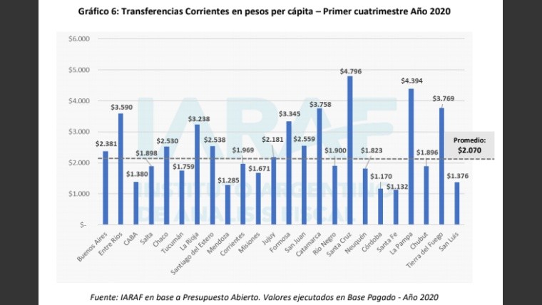 "Buenos Aires, Santa Cruz, Entre Ríos y La Rioja, fueron las más beneficiadas de su grupo de pertenencia. En términos absolutos, el mínimo lo registra Santa Fe quien recibió el equivalente a $1.169 per cápita, mientras el máximo corresponde a La Rioja con $7.711 por habitante en el cuatrimestre", según el informe publicado por el Instituto Argentino de Análisis Fiscal (Iaraf).