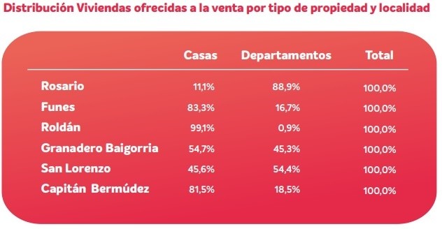 El centro concentra casi el 34% de las propiedades habitacionales ofertadas a la venta, le siguen con proporciones superiores al 6%, Lourdes y Pichincha, mientras que con pesos del orden el 5%, Martin, Abasto, República de la Sexta y Echesortu. Considerando los barrios con mayores propiedades para venta, la oferta se concentra por encima del 95% en departamentos. La excepción la constituye el barrio de Echesortu, donde el peso de las casas se aproxima al 8% del total ofrecido.