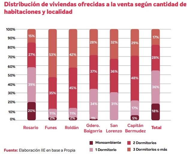 La oferta de propiedades para la venta en la región se distribuye un 18,1% en monoambientes, un 36,4% en las viviendas de 1 dormitorio, un 28,2% en 2 dormitorios y el 17,3% restante en las que cuentan con 3 dormitorios o más. Sin embargo, si se pone la lupa en Rosario, se encuentra que el 20% son monoambientes, 39% una habitación, 27% dos habitaciones y 15% tres.