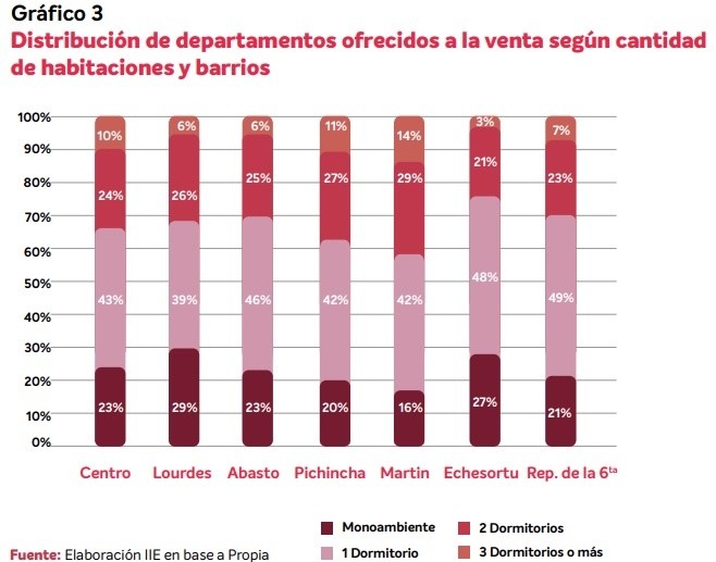 En lo que respecta al tamaño de los departamentos para la venta, prevalecen las unidades más pequeñas (monoambientes y un dormitorio), rondando el 60% de la oferta en la mayor parte de los barrios analizados. No obstante, en barrio Martin hay una mayor presencia de departamentos de mayor tamaño.