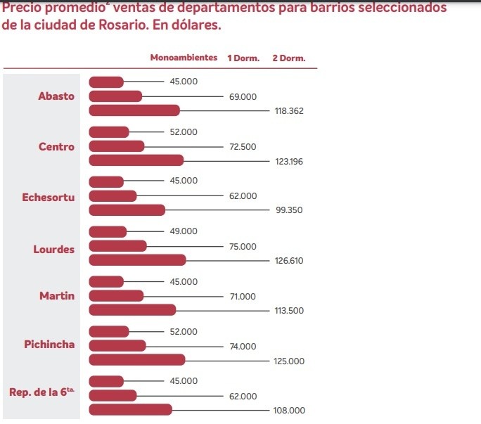 El valor más bajo se observa en República de la Sexta, donde el precio del metro cuadrado es de 1.333 dólares. Considerando los departamentos de dos dormitorios, se registra en Pichincha el valor más alto del metro cuadrado, superando los 1.700 dólares. Le siguen el centro con más de 150 dólares menos y, Abasto y Martin, con guarismos que rondan los 1.500 dólares el metro cuadrado. En esta oportunidad, el valor más bajo se registra en Echesortu, donde el promedio no alcanza los 1.300 dólares el metro cuadrado, considerando este tipo de unidades.