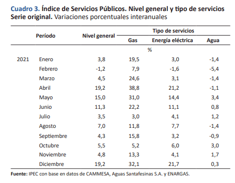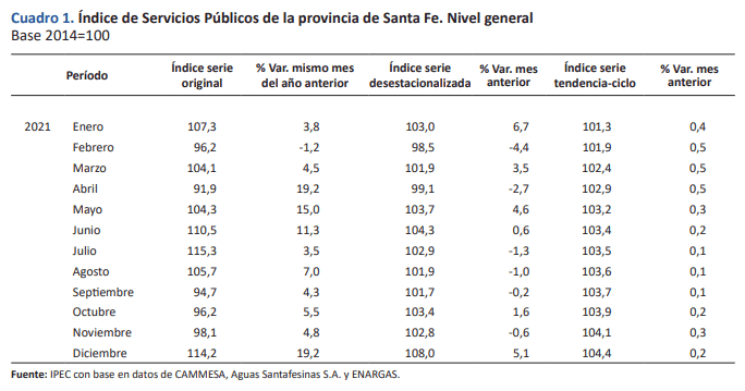 El Índice de Servicios Públicos comprende los servicios de Gas, Energía eléctrica y Agua, elaborado por el Instituto Provincial de Censos y Estadísticas (IPEC). El Índice de Servicios Públicos (ISP) de Santa Fe registró en diciembre de 2021 una variación positiva de 19,2% respecto al mismo mes de 2020.