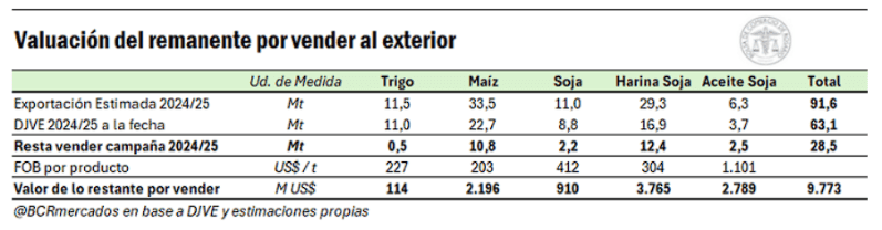 Si se valúa la mercadería que resta vender al exterior de la campaña 2024/25 al precio FOB de exportación vigente el día viernes, se estima que el valor total del trigo, el maíz, y el poroto, la harina y el aceite de soja que resta vender al exterior para cumplir con el programa exportador estimado para la campaña alcanza US$ 9.770 millones. Vale recordar que el Decreto publicado en el Boletín Oficial pone un límite a las operaciones beneficiadas por la eliminación temporal de retenciones de 7.000 millones de dólares en ventas al exterior.