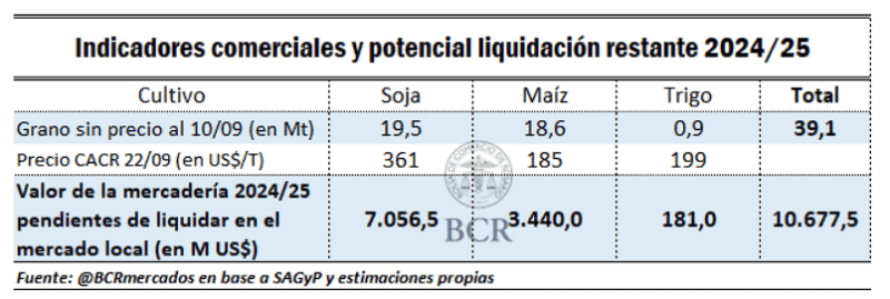 Del total, al 17 de septiembre ya se comercializaron 77,5 Mt, de las cuales 68,7 millones de toneladas ya tienen precio en firme. Si al volumen de granos que resta comprar a la industria y a la exportación le sumamos el volumen de mercadería comprada que a la fecha no se le ha puesto un precio en firme, promediando septiembre el stock de trigo, soja y maíz que o bien no había sido vendido o bien aún permanecía con precio pendiente de fijación ascendía a 39,1 millones de toneladas. Valuando este tonelaje al precio de la Cámara Arbitral de Cereales de Rosario del lunes 22/09 el monto pendiente de pagarle al vendedor doméstico del grano asciende –teóricamente- a US$ 10.678 millones de dólares.