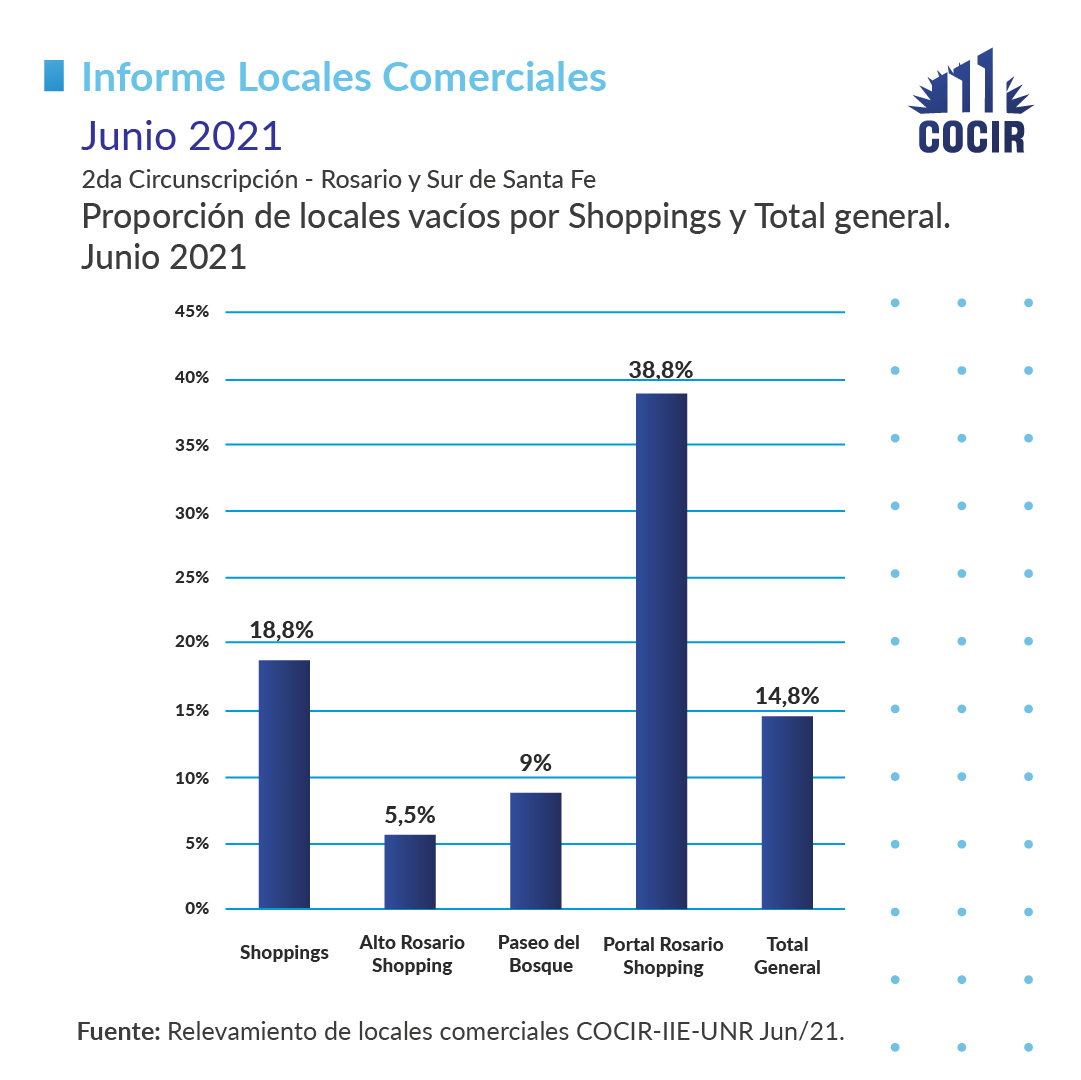 El de mayor proporción de vacíos es el Centro Comercial Fisherton donde la tasa alcanza a casi el 18% de los locales. Le siguen con tasas por encima de la media el centro comercial Cafferata (que incluye el Mercado del Patio) y el CC Alberdi, con valores del 15,8% y 12,7% respectivamente. El resto se encuentran con proporciones de locales vacíos o desocupados por debajo del promedio.