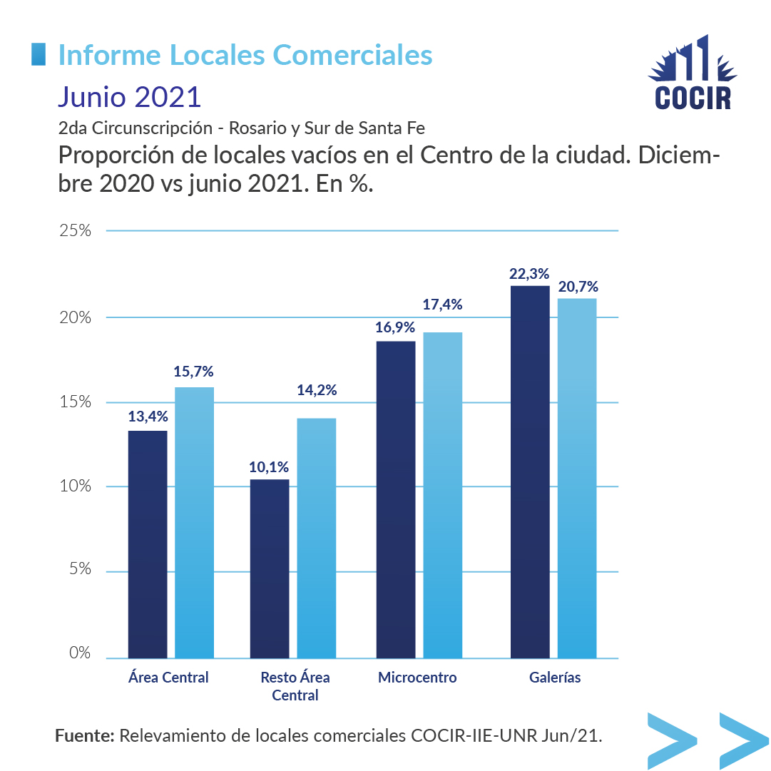 La comparación respecto con diciembre de 2020 muestra que hubo aumento de 2,3 puntos porcentuales en la tasa de locales vacíos en el centro, que se explica por el incremento (4,1%) en la tasa de vacancia en el resto del área y levemente en el microcentro (0,5%), mientras que en las galerías se evidencia una reducción (1,6%).