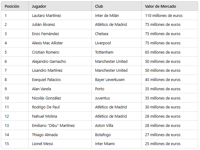 Inmediatamente detrás de Martínez, aparece un joven que sigue escalando tanto en talento como en valor. Julián Álvarez, quien, tras un periodo de adaptación en el Atlético de Madrid, ha mostrado un crecimiento sostenido y ahora cuenta con una cotización de 75 millones de euros. Junto a Álvarez, otros talentos argentinos como Enzo Fernández y Alexis Mac Allister comparten el mismo valor de mercado. Ambos han llevado su carrera a ligas de máxima competencia y han sabido mantener su nivel en equipos como Chelsea y Liverpool, respectivamente, lo que los posiciona como jugadores de relevancia en el radar de los grandes inversores del fútbol.