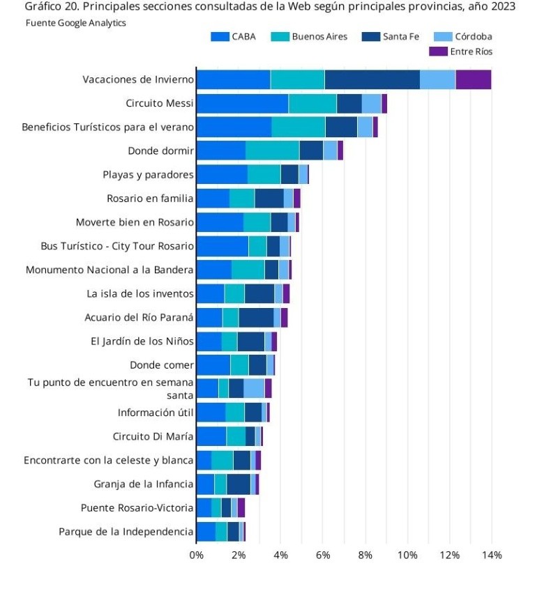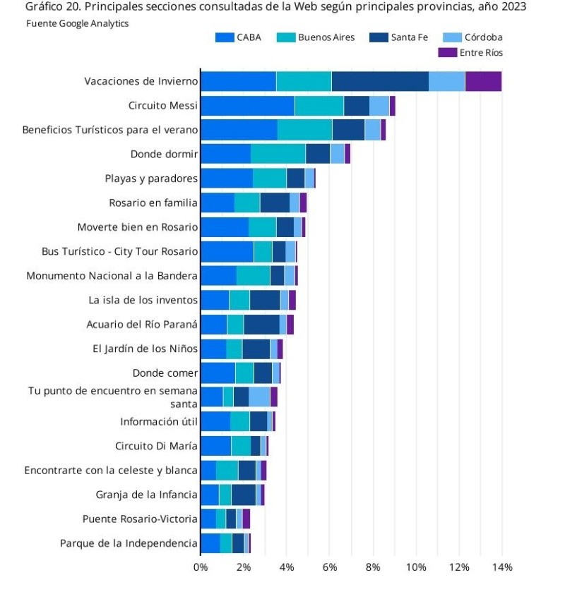 Del total de usuarios argentinos, se muestran cuáles son las secciones más visitadas al navegar en la web oficial y app de turismo de Rosario. Las vacaciones de invierno, el circuito Messi y beneficios turísticos para el verano lideraron las búsquedas. En el siguiente cuadro se dieron a conocer las principales consultas que se realizan sobre turismo en la ciudad.