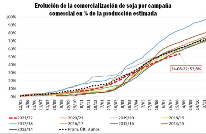Al evaluar la situación comercial en relación con la producción de soja 2021/22 (estimación de GEA/BCR se ubica en 42,2 M. Tn.), se ha vendido el 53,8% de la cosecha por parte de los productores siendo el menor ratio desde el ciclo 2003/04.