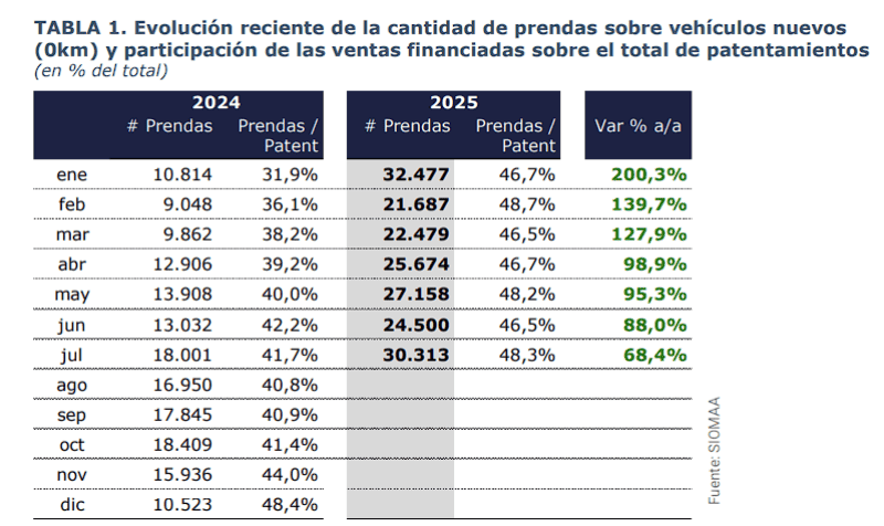 Con los datos cerrados de julio, las inscripciones de prendas sobre 0km acumulan en lo que va del año un 110,4% de crecimiento respecto a los mismos 7 meses de 2024, y en el caso de la financiación de transferencias de usados, las prendas acumulan una suba del 41,7%.