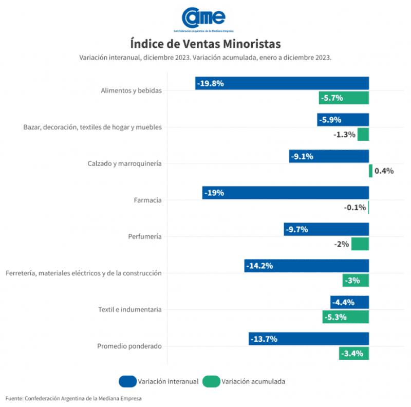 Así surge del Índice de Ventas Minoristas Pymes de la Confederación Argentina de la en Mediana Empresa (CAME), elaborado en base a un relevamiento mensual entre 1.256 comercios minoristas del país, realizado del 2 y 5 de enero de 2024.