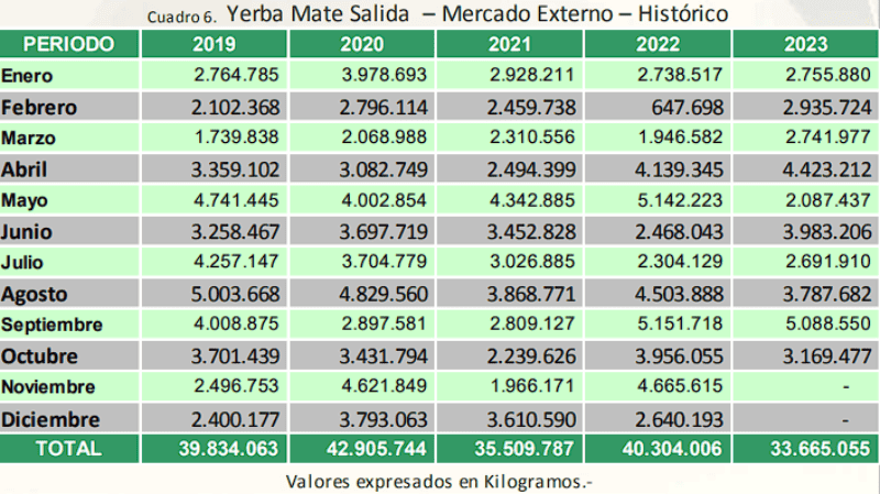 Los datos estadísticos registrados por el Instituto Nacional de la Yerba Mate (INYM) revelan que durante el mes de Octubre de 2023 el volumen de yerba mate exportada alcanzó los 3.169.477 Kilogramos. Sumado a los meses anteriores las salidas con destino al mercado externo totalizan 33.665.055 Kilogramos para el período Enero-Octubre de 2023.
