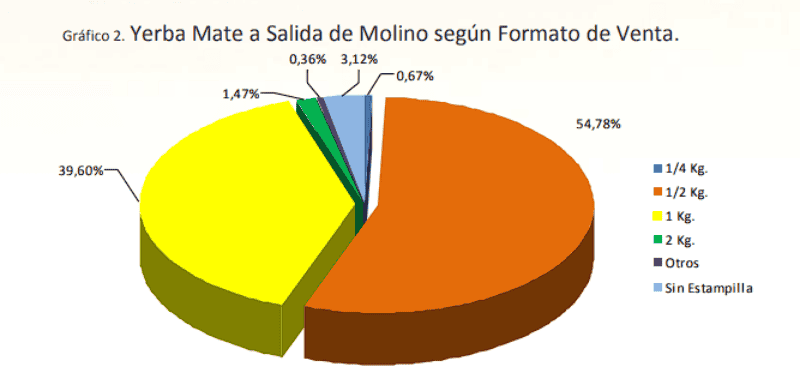 Con el 39,60% se ubicaron los paquetes de un kilo, con el 1,47% los envases de dos kilos, y con el 0,67% los de cuarto kilo. En el ítem 'otros formatos' las salidas alcanzaron 0,36%, mientras que 3,12% correspondió al rubro 'sin estampillas'.