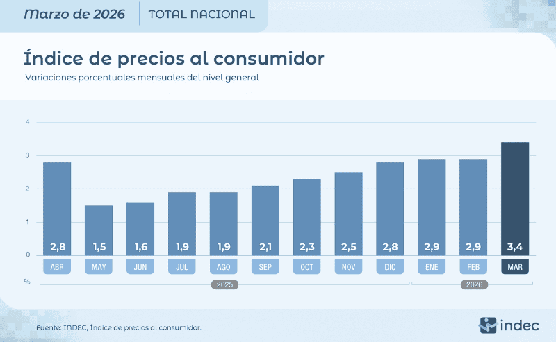 El Instituto Nacional de Estadística y Censos (INDEC) informó que la inflación de marzo en Argentina se ubicó en el 3,4%, mostrando una leve aceleración respecto al mes previo y generando señales de alerta en el rumbo de los precios.