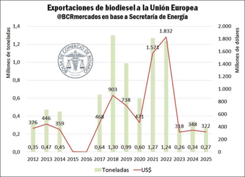 La posible restricción llega en un momento particularmente delicado para el sector. Durante 2025, las exportaciones de biodiesel argentino registraron los niveles más bajos desde la creación de esta industria, lo que refleja un escenario complejo para los productores y empresas vinculadas a esta cadena productiva. Santa Fe, la provincia donde se concentra la totalidad de las terminales exportadoras de biodiesel del país, también mostró su preocupación ante la posición adoptada por la UE.