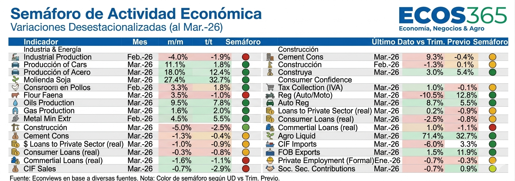 El primer cuatrimestre del año 2026 ha consolidado un escenario de contrastes que redefine las proyecciones corporativas. El último informe del semáforo de actividad elaborado por la consultora Econviews expone con crudeza matemática la existencia de una economía fuertemente fragmentada. Los números desestacionalizados no dejan lugar a dobles interpretaciones: mientras determinados motores productivos aceleran con una firmeza inédita, otros sectores, profundamente arraigados en la cotidianidad del ciudadano promedio, pisan el freno de manera abrupta. Descifrar la anatomía de esta asimetría resulta indispensable para diseñar modelos de gestión que logren navegar la coyuntura sin comprometer el capital de trabajo.
