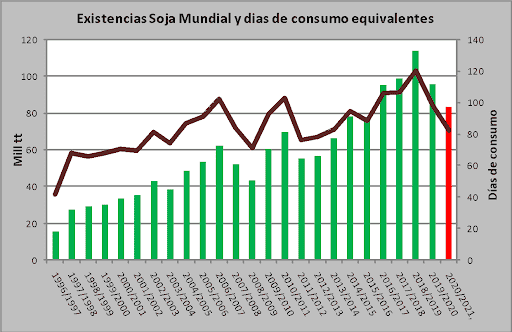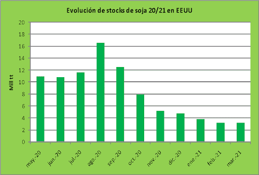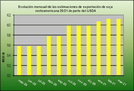 Asimismo, para dimensionar la firmeza de las ventas externas norteamericanas, el volumen actual se traduce en un máximo histórico que excede en 19 mill tt los envíos del año comercial 19/20.