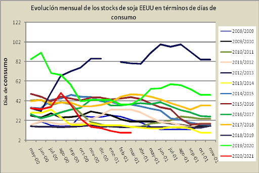 Una forma de analizar lo preocupante que resulta el ciclo 20/21 en EEUU es a través de las existencias en términos de días de consumo. Tal como lo muestra la línea roja del gráfico 3 los stocks alcanzan para abastecer 10 días de demanda en ese país (tanto local como internacional), lo cual estacionalmente es el ratio más bajo para el mes de marzo (hasta el momento los mínimos los habíamos visto en 10/11 y 12/13 con 15 días en cada caso).