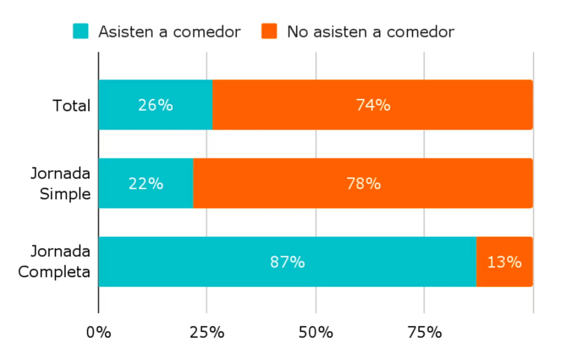 Cuando se analiza la asistencia por tipo de jornada a la que asiste el estudiante, se observa que el 86% de los que asisten a jornada completa reciben almuerzo, mientras que entre los que asisten a jornada simple lo recibe el 22%.