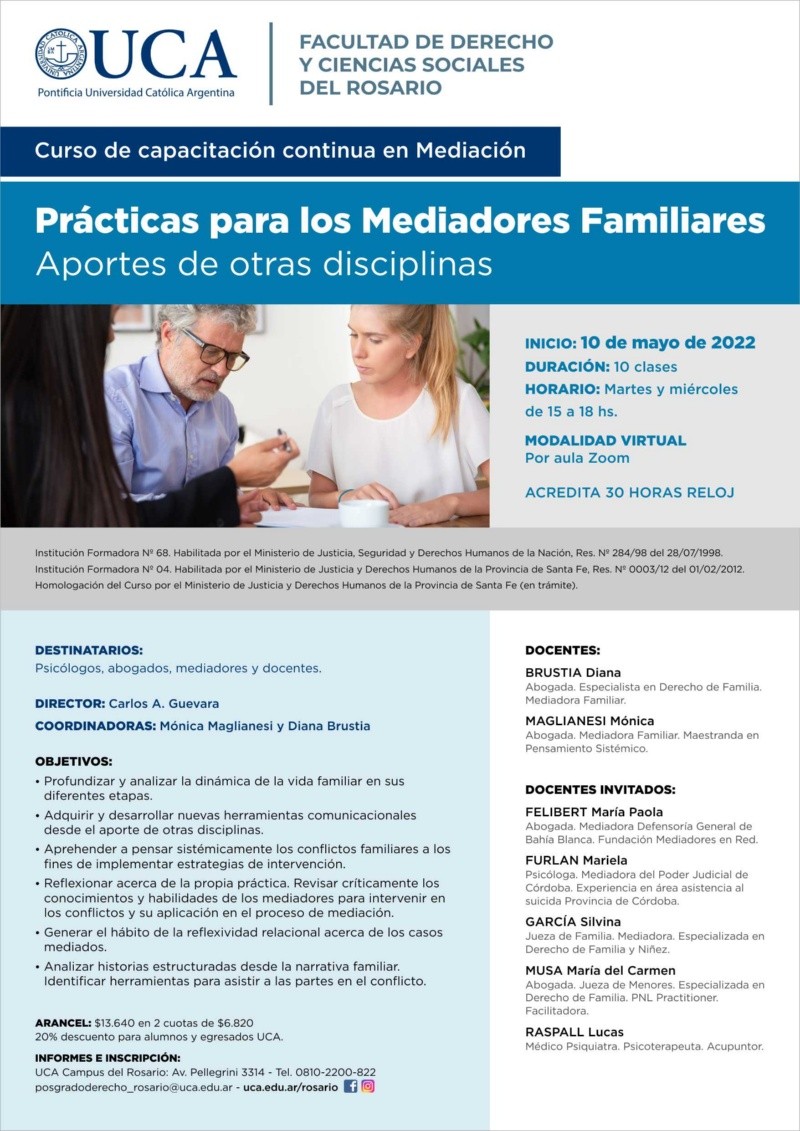 El Curso de Capacitación continua en Mediación: Prácticas para los Mediadores Familiares se llevará a cabo este martes 10 de mayo a las 15 horas hasta las 18 horas.