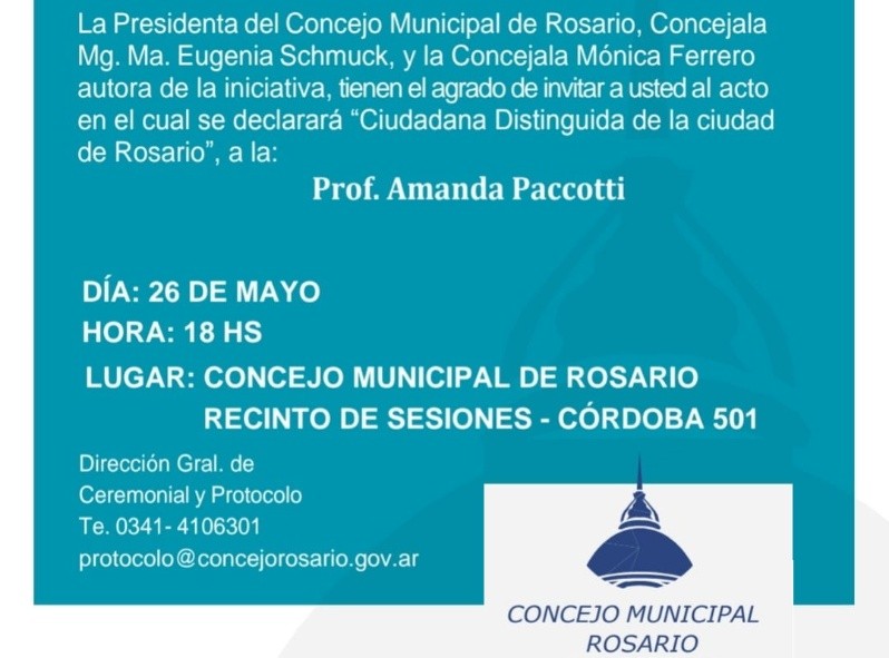 La tantas veces enunciada prioridad que debe tener la educación, y el reconocimiento a las y los educadores, tendrá este jueves un gesto simbólico no menor en el Concejo de Rosario. A las 18, en el recinto de sesiones los ediles entregarán un diploma como "Ciudadana Distinguida" a la maestra y referente Amanda Paccotti.