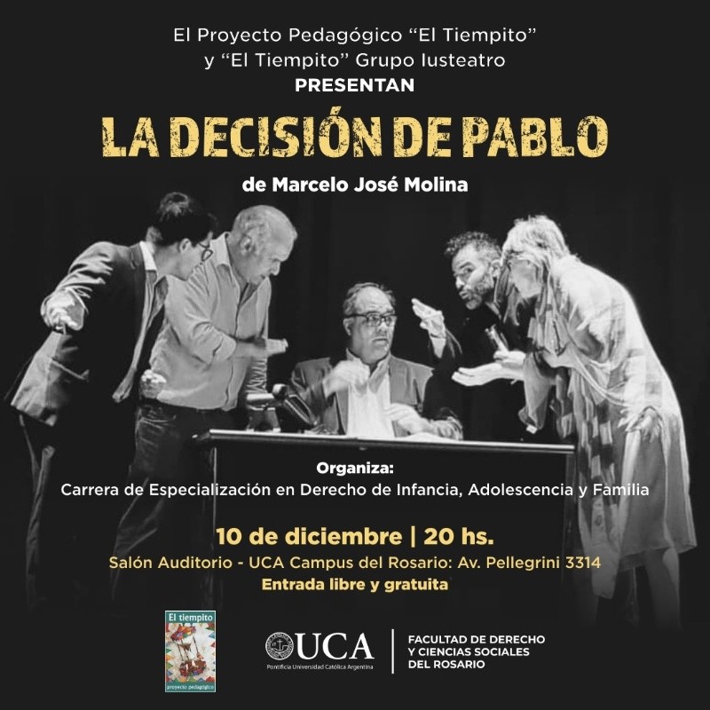 El Proyecto Pedagógico "El Tiempito" y "El Tiempito" Grupo Iusteatro presentan la obra: La decisión de Pablo, de Marcelo José Molina, con la participación de alumnos, docentes y directivos de la Facultad de Derecho y Ciencias Sociales del Rosario.