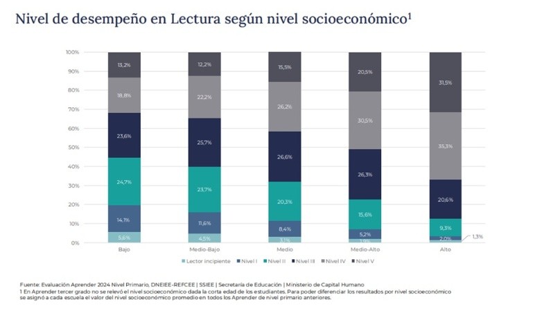 En el quintil más bajo, es decir el de las escuelas más pobres, solo 1 de cada 3 estudiantes (32%) alcanza el nivel esperado de lectura. Mientras que en el otro extremo, en el quintil más alto, la cifra asciende a más del doble: 66,8%. A su vez, entre los alumnos más favorecidos del país, 1 de cada 10 (12,3%) queda por debajo del umbral mínimo (Nivel 3), mientras que de otro lado son 4 de cada 10 (44,4%) quienes no alcanzan ese nivel.