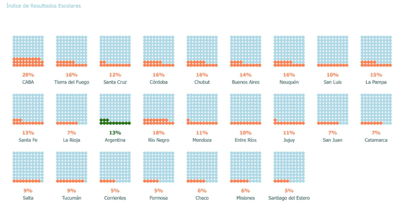 Las dos jurisdicciones con mejores índices en 2022 son CABA (29%) y Río Negro (18%). Hay varias jurisdicciones donde menos del 10% de los estudiantes llegan al último año de secundaria con la edad y los conocimientos esperados; la cifra desciende al 5% en Corrientes, Formosa y Santiago del Estero.