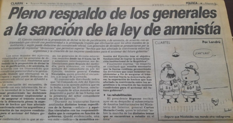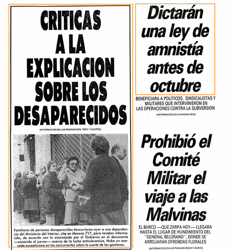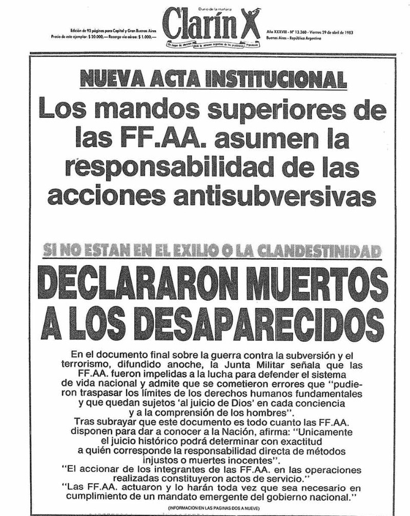 Ya en esa tapa de fines de abril del diario Clarín se abría, en paralelo a las críticas y demandas por el Documento final, el debate que venía: la herramienta legal que el Ejército preparaba para una “autoamnistía”.