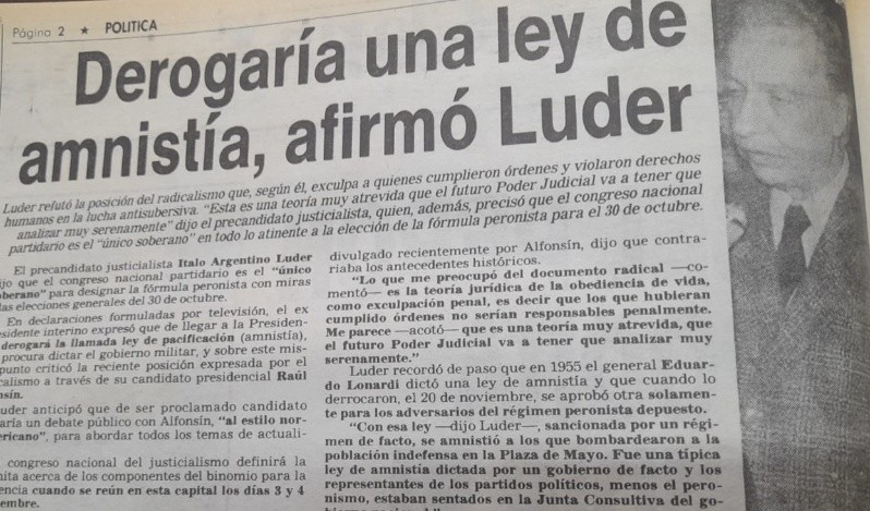Si bien Italo Luder, el candidato del peronismo, se manifestó en contra de la amnistía en un primer momento y dijo que la derogaría (ver artículo abajo), la cúpula del PJ “parecía estar de acuerdo con mantener la ley de pacificación con el argumento de que sus efectos serían irreversibles”.