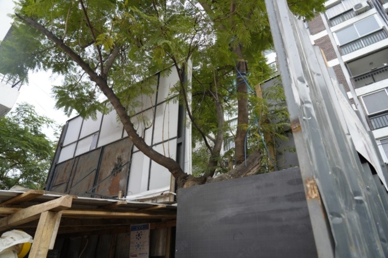 El árbol se encuentra dentro del cerco de la obra, entre el ingreso y una casilla de resguardo de los empleados. Al perderse el uso de la vereda durante la obra, fue colocada una pasarela por fuera para los transeúntes pedestres y la línea de edificación va al ras de la vereda, no tiene retiro hacia adentro.