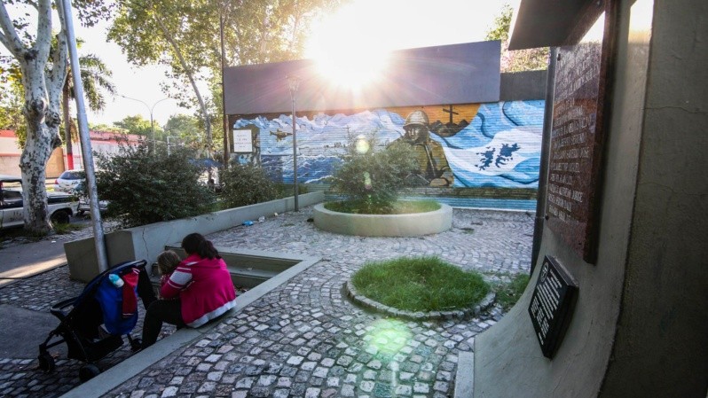 En la avenida Presidente Perón al 3800, Carolina espera que su hija salga del jardín Floriano Zapata que está enfrente. Se sentó en un escalón de la plazoleta 2 de Abril, un triángulo con monolito y mural que recuerda a los ex combatientes de Malvinas. No prestó atención a que detrás de ella está la placa que recuerda a los soldados de Rosario que perdieron al vida en el conflicto bélico de 1982.