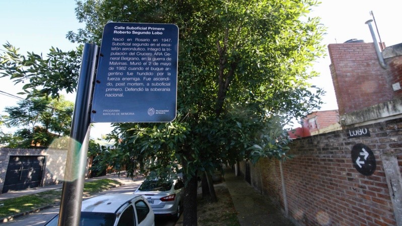 María Esther Di Pietro vivía en la calle 1842 que después pasó a ser Lobo. La señalética recuerda que fue un rosarino tripulante del Crucero ARA General Belgrano. "Murió el 2 de mayo de 1982 cuando el buque argentino fue hundido por la fuerza enemiga. Defendió la soberanía nacional", indica.