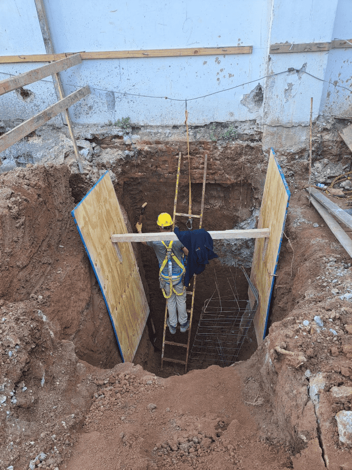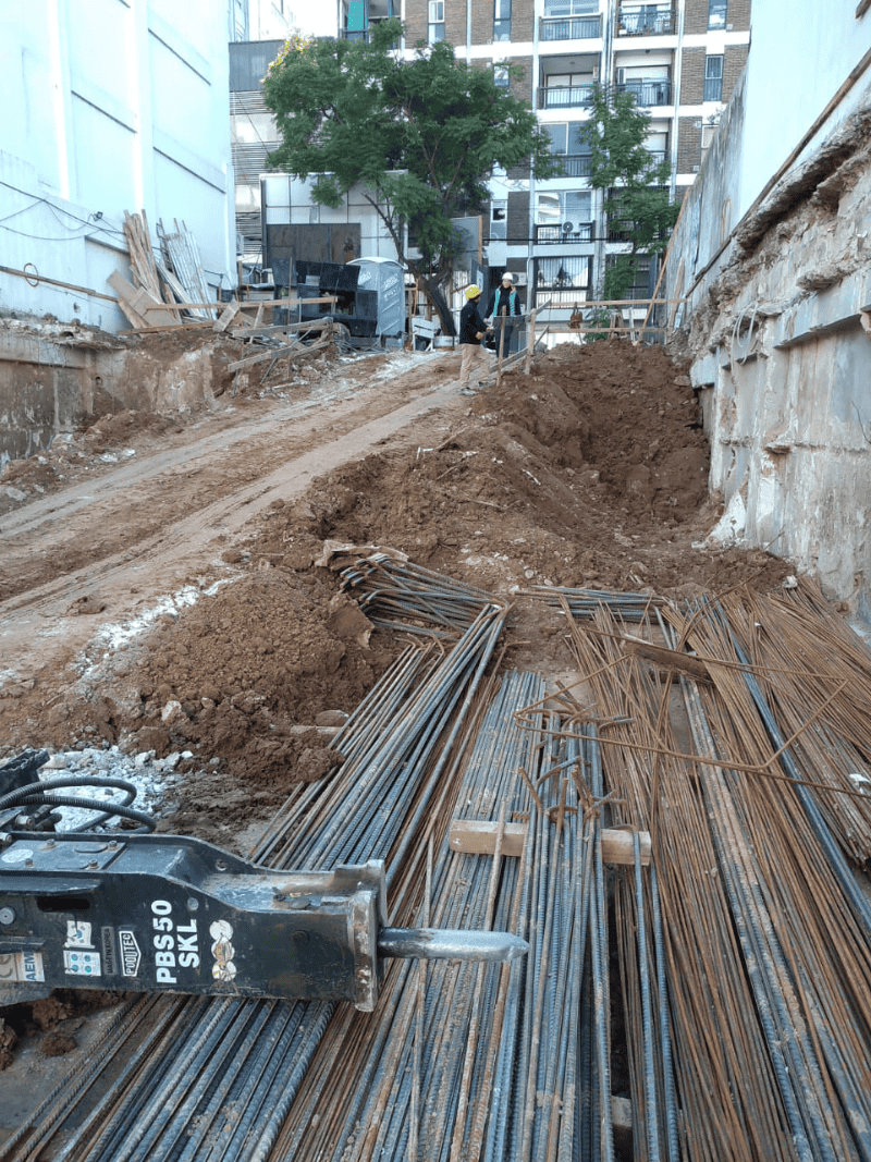 Luego se intervendrá en la demolición y posterior submuración de los tabiques este y oeste. al mismo tiempo, se está realizando el hormigonado de las troneras en medianera del lado oeste mediante el proceso de gunitado u hormigón proyectado.