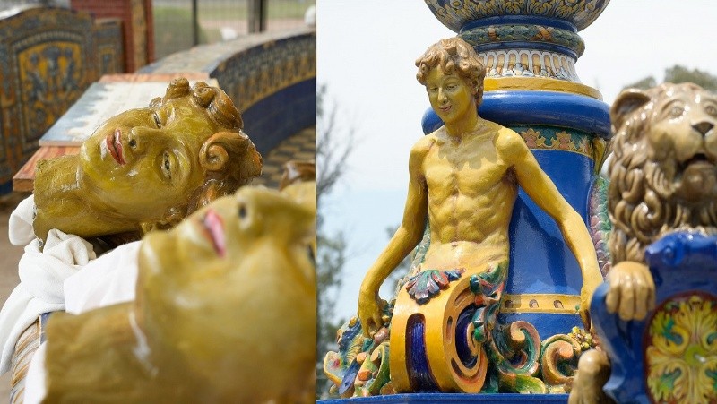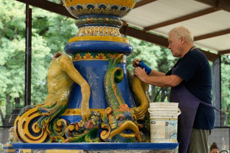 Berton compartió a este medio la experiencia de esta empresa familiar que lleva tres generaciones con decenas de reparaciones en Rosario y otras ciudades del país, como los vitrales de la catedral de Rosario y los de la Legislatura de Santa Fe, o las estructuras edilicias del palacio Fuentes y el museo Estévez. El grupo Fantoni se compone de Gustavo Berton (que es arquitecto, restaurador y técnico electrónico), su mamá Bernardetta y su tío Nanni Fantoni, su pareja Paola Patiño, su primo Luciano Stagni y varios amigos que dieron una mano. “Mi madre de 77 años y mi tío de 73 son buenos dibujantes, tienen muy buen trazo. Los bancos los pintaron a mano alzada, en pleno invierno y durante horas en el parque”, destacó orgulloso. Tienen su taller familiar en el barrio Sarmiento, pero armaron “un taller móvil” en su camioneta para contar con todas las herramientas necesarias cada vez que trabajaban in situ junto a la fuente. La fuente se compone de ocho mil mayólicas, entre las planas y las de volumen. Fue pintada con acrílicos, barnices y lacas poliuretánicas resistentes al clima. Y sobre las esculturas, que debieron crear a nuevo, Berton recordó: “De los efebos teníamos una sola cabeza. A uno le faltaba el brazo derecho y al otro el izquierdo, por lo que replicamos cada una de esas figuras. Los leones estaban en unas cajas, repartidos en pedazos. Con lo que encontramos pudimos armar un león entero, y fue con ese que pudimos crear el molde para los otros tres. Fueron armados con cemento para que sean resistentes”. Los hermanos Fantoni son hijos de Giuseppe Fantoni, un joven inmigrante de Bologna que escapó de la Segunda Guerra “perseguido por ser artista”, quien trajo el oficio de restaurador junto a sus nueve hermanos. Según recordó su nieto, la de los Fantoni es una tradición familiar que lleva siglos desde Italia: “Lo que sabemos es que el taller allá data del 1600, con reminiscencias del 1400 en la cuestión edilicia del Ayuntamiento de Bologna con la firma de los Fantoni. Pero no tengo mucho registro sobre eso”. Muchos piensan que el oficio de restaurar es hacer un arreglo muy simple, pero es un trabajo inmenso que conlleva moldear, diseñar, cortar, manipular químicos, hornear, dibujar a mano alzada sobre el cerámico ya instalado con un pulso milimétrico. A eso se suma, en el caso de la Fuente de los Españoles, la parte técnica e hidráulica que fue diseñada e instalada para la circulación del agua. Para que la fuente vuelva a su esplendor, solo resta el encendido de su sistema hidráulico, que a partir de este domingo comenzará a funcionar gracias a la cisterna y dos bombas que fueron instaladas, las cuales funcionarán alternadamente. El surtidor del pilón es el corazón de la fuente, el cual en los primeros días del comienzo de la refacción en enero pasado, Juan Augusto "Nanni" Fantoni comenzaba a repasar a mano alzada sus ornamentos dorados, anaranjados y verdes. "Volverá a lanzar agua después de 27 años. Y ahora tendrá más chorros: en su base el agua saldrá de unos rostros con forma de soles (conocidos como sátiros), y también saldrá de otros 12 puntos en las paredes de cada uno de sus seis lados, que fueron agregados al diseño original”, precisó el director de la restauración. El sistema hidráulico fue instalado de manera completa, con sistema de cañería y desagües, así como también un sistema eléctrico para los focos que iluminarán la fuente por la noche. Afortunadamente, ahora se utilizan materiales de construcción modernos para ganar rigidez, “pero la técnica artesanal es la misma que la utilizada por Ruiz de Luna cien años atrás. No es reemplazable por ninguna impresora 3D”, agregó el funcionario Ferrer. Las palabras no son suficientes para describir una obra de este nivel de trabajo artesanal. “Su creador Ruiz de Luna, hizo uno de los efebos cinco veces porque no le gustaba cómo le salían, y los rompía”, aseguró Berton en torno al dificultoso trabajo que conlleva cada pieza de esta fuente renovada que ya es parte del patrimonio rosarino.