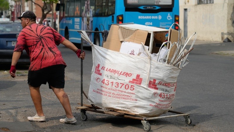 A su lado, Gabriel estira las piernas con cuidado. A diferencia de Rosa, reconoce el dolor en sus articulaciones enfermas y encima, exigidas por la caminata diaria –dice que recorre a pie unas 70 cuadras por jornada– y el detenimiento minucioso en cada container a revisar. Los 57 años pesan mucho. Y también una vida dura de trabajo que comenzó a los 7 años en la zona sur de Rosario vendiendo verduras. Después trabajaría en la construcción y como vendedor ambulante, siempre intercalando esas changas con el cartoneo. Su último empleo fue de cuidador de un comercio y lo echaron.