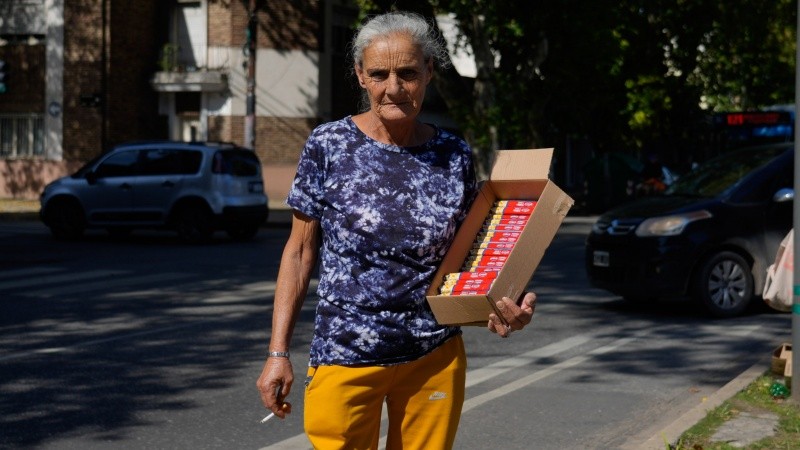 A una cuadra, por Avellaneda y Montevideo, conviven Carmen, sobre la avenida, y Mario, por la calle en donde los autos van hacia el centro. A los jubilados se les dice pasivos: no es su caso. Ella tiene 63 años y ofrece turrones (ya ajustó a cinco por dos mil pesos). En 2024, se instaló en ese lugar pero se dedicó toda la vida a la venta callejera: dulces, alfajores, chocolates, toallones.