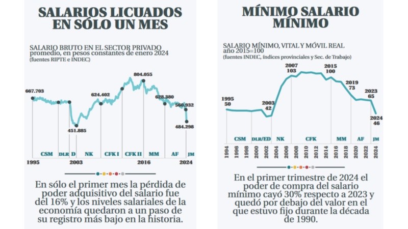 La depresión salarial de los trabajadores argentinos es tal que en febrero el Indec calculó en $596.823,18 pesos el costo de la canasta básica total para un hogar tipo 2 (dos adultos y dos menores) mientras que el salario mínimo vital y móvil fue de $180.000 pesos –hoy se encuentra en $202.800–. En su informe de marzo, el Mirador de la Actualidad del Trabajo y la Economía (Mate) midió que la inflación acumulada para el primer bimestre de 2024 fue del 46%. Lo que elevó la interanual de 161 a 254% en Argentina. Dato al que se le suma la última medición de pobreza que realizó la Universidad Católica Argentina (UCA) que arrojó un 57,4% de personas en esa situación (27 millones).