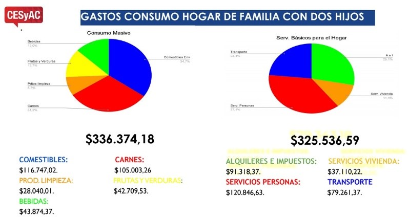 Según datos del Centro de Educación, Servicios y Asesoramiento al Consumidor (Cesyac), una familia tipo de cuatro integrantes –una pareja con dos hijos– necesitó $664.910 en diciembre del 2023 para cubrir los gastos en productos de consumo masivo y servicios básicos para el hogar, las dos categorías que la entidad considera para la composición de la canasta básica rosarina, que ese mismo mes registró un aumento interanual del 190%.