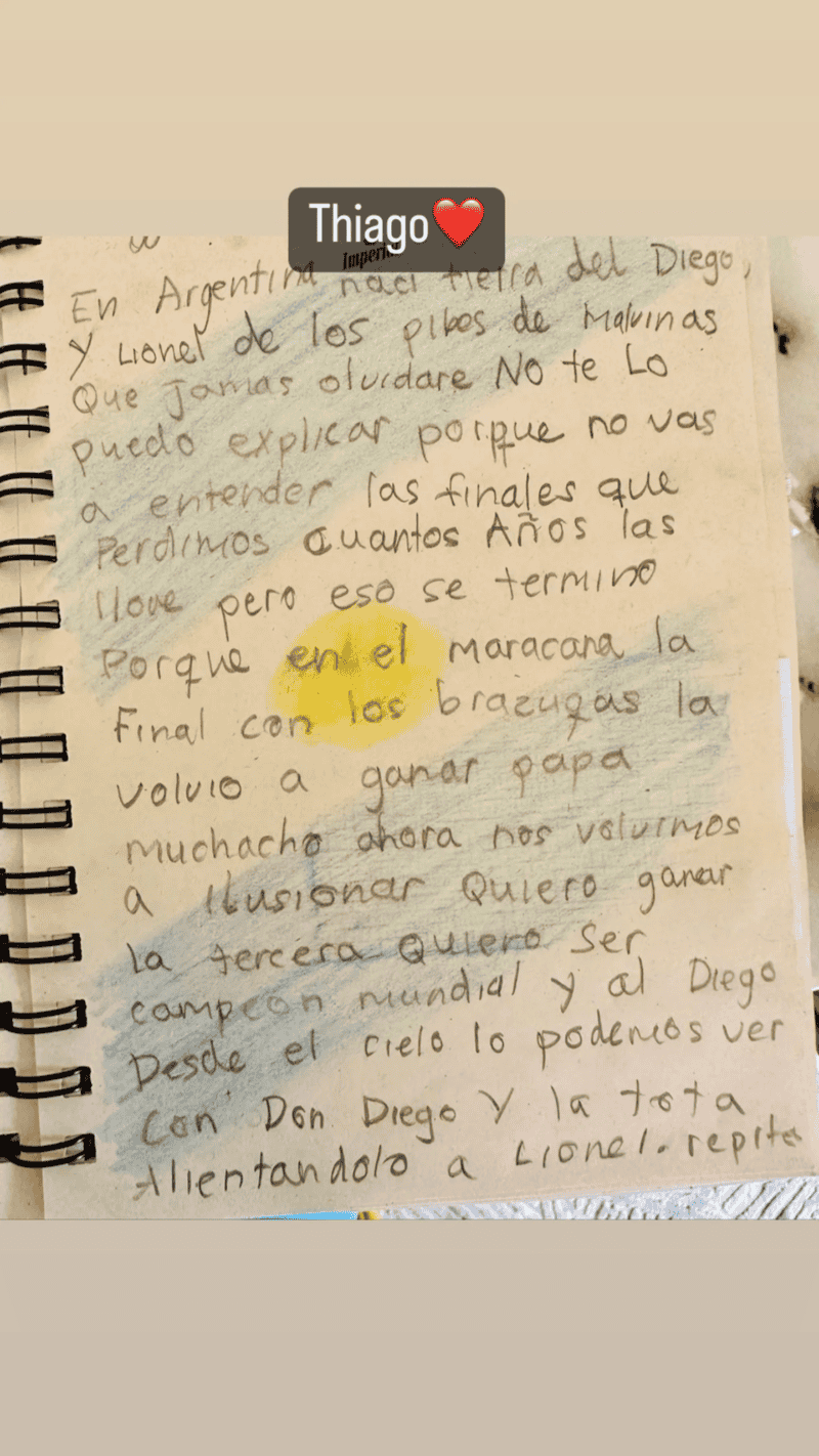 Lo cierto es que el furor mundialista en las horas previas a la final de Qatar 2022 se ve reflejado en todos lados y el hijo más grande de los rosarinos no ha sido la excepción. A un día del último partido de la Copa del Mundo entre Argentina y Francia (este domingo a las 12), Antonela compartió a través de una historia de Instagram la carta que escribió su hijo Thiago con la letra de la canción "Muchachos, ahora nos volvimos a ilusionar".