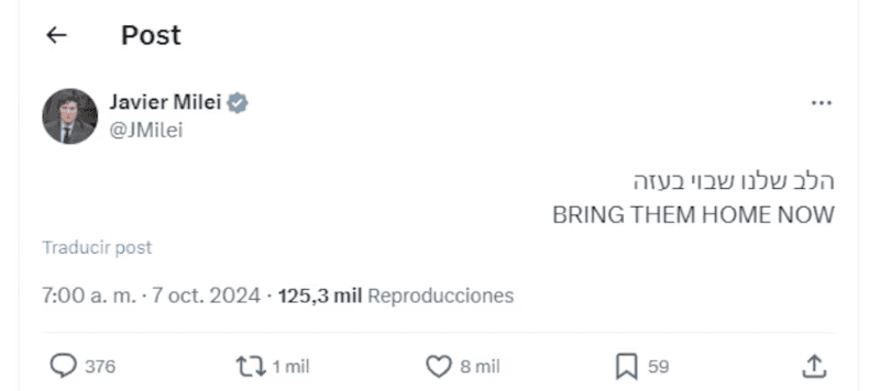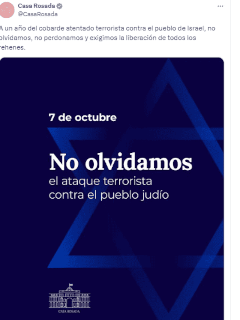 Por otro lado, la cuenta oficial de la Casa Rosada expuso en la misma red social: "A un año del cobarde atentado terrorista contra el pueblo de Israel, no olvidamos, no perdonamos y exigimos la liberación de todos los rehenes".