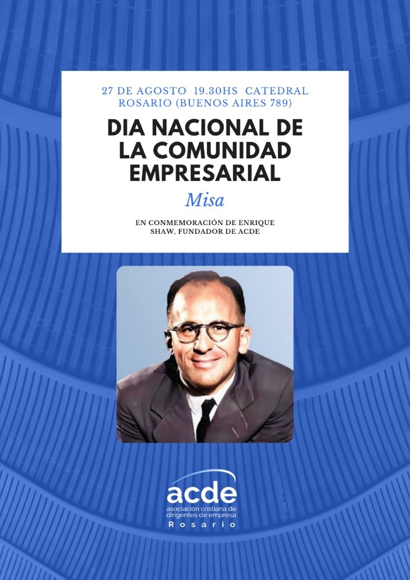La Asociación Cristiana de Dirigentes de Empresa (ACDE) Rosario invita a la comunidad empresaria y al público en general a participar de una misa en conmemoración del Día Nacional de la Comunidad Empresarial, que se celebrará el próximo miércoles 27 de agosto a las 19.30 en la Catedral de Rosario (Buenos Aires 789).