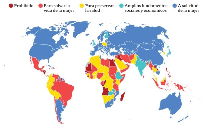 El Centro de Derechos Reproductivos, una organización global de defensa legal que busca promover los derechos reproductivos, clasificó en cinco categorías el estado del aborto en cada país según el grado de restricción: prohibido, permitido para salvar la vida de una mujer, permitidos para preservar la salud, permitido bajo amplios fundamentos sociales o económicos y a solicitud de la mujer (varía el límite gestacional).