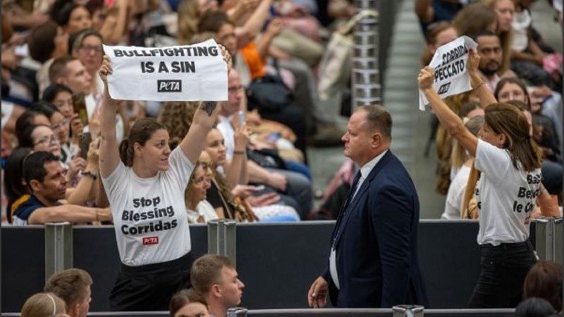 Dos mujeres protestaron este miércoles contra las corridas de toros durante la audiencia general que celebraba el papa Francisco en el aula Pablo VI del Vaticano y, tras mostrar algunos carteles, fueron acompañadas a la salida sin mayores problemas.