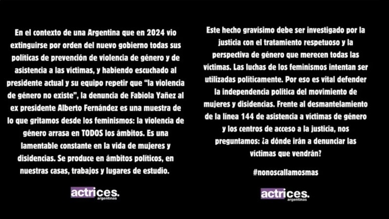 En el final, el texto de Actrices Argentinas argumenta que “por eso es vital defender la independencia política del movimiento de mujeres y disidencias. Frente al desmantelamiento de la línea 144 de asistencia a víctimas de género y los centros de acceso a la justicia, nos preguntamos: ¿a dónde irán a denunciar las víctimas que vendrán?”, concluye, antes del cierre, con el hashtag #Nonoscallamosmas.