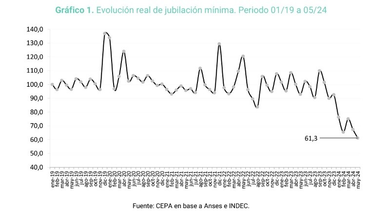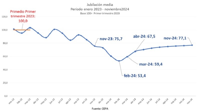 El Cepa calcula, sin contar los bonos, que "respecto del primer trimestre del 2023, en abril las jubilaciones quedarían 32,5 por ciento por debajo en términos reales, habiendo tocado un mínimo de -47 por ciento en febrero. Los jubilados pueden aspirar, en el mejor de los casos, a que la pérdida se consolide en torno al 25 por ciento".