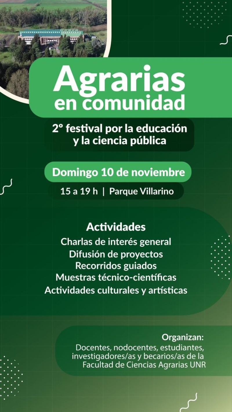 La facultad de Ciencias Agrarias de la Universidad Nacional de Rosario convoca al segundo festival por la educación y la ciencia pública. El evento será el próximo domingo de 15 a 19 en el Parque Villarino de Zavalla y contará con un nutrido cronograma.
