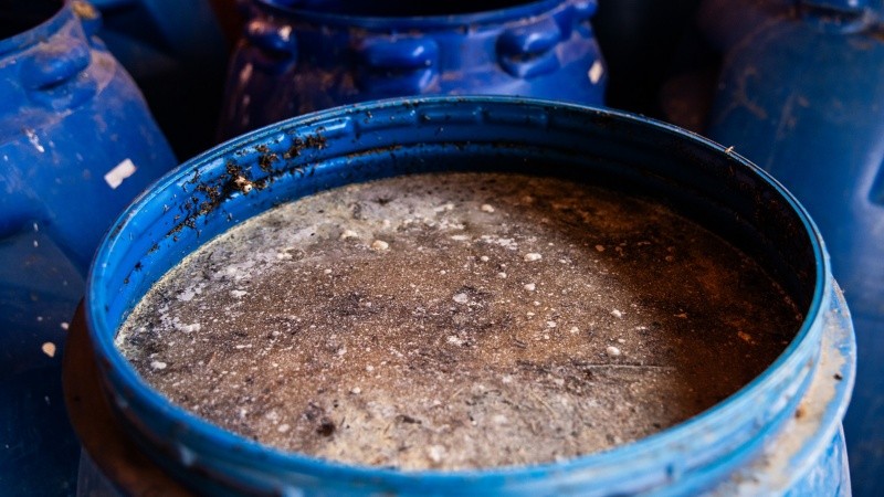 De los cuatro biofertilizantes líquidos que fabrican, el más complejo es el supermagro. La bosta y la leche la retiran del tambo de la facultad. A cambio, cuando los agrónomos e investigadores necesitan, ellos le suministran sus insumos. En uno de los tachos azules altos, de 50 litros, meten la mezcla, que incluye agua sin cloro y tierra, de la capa superficial.