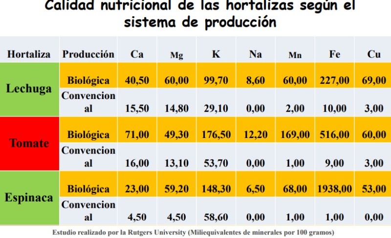 ¿Cómo se traducen esos déficits en la calidad de los alimentos que comemos? En la tabla compartida en la charla, expuso la “calidad nutricional” de algunos alimentos. Es notable, por ejemplo, la diferencia de hierro en las espinacas que se cosechan con el método “biológico” versus el “convencional”. Una brecha de 1900 a 1.